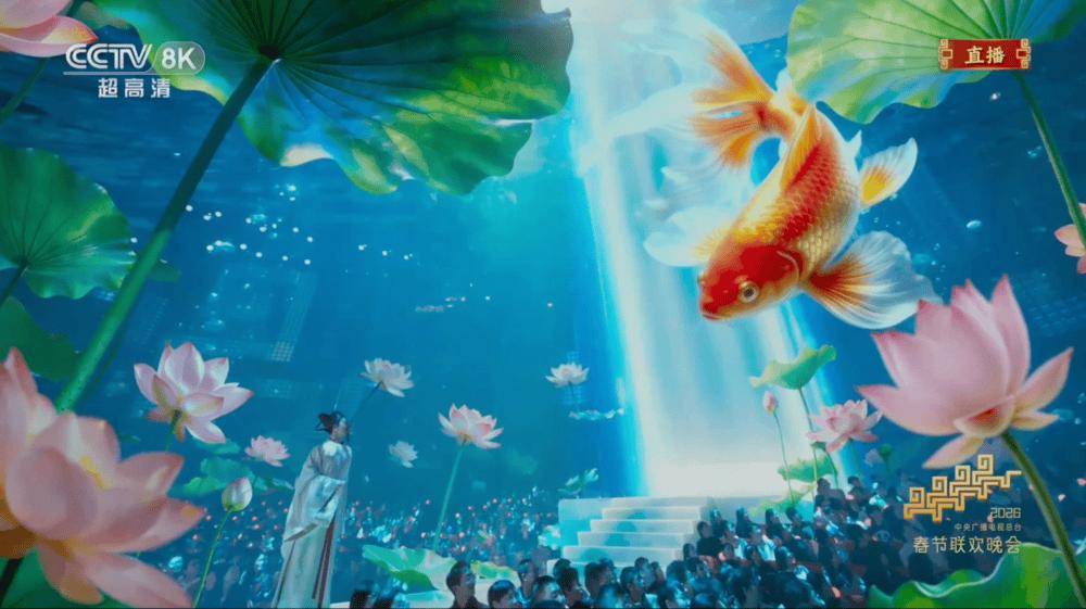 歌咏创意秀《贺花神》正在蜀葵花和金鱼的视觉制做中,
