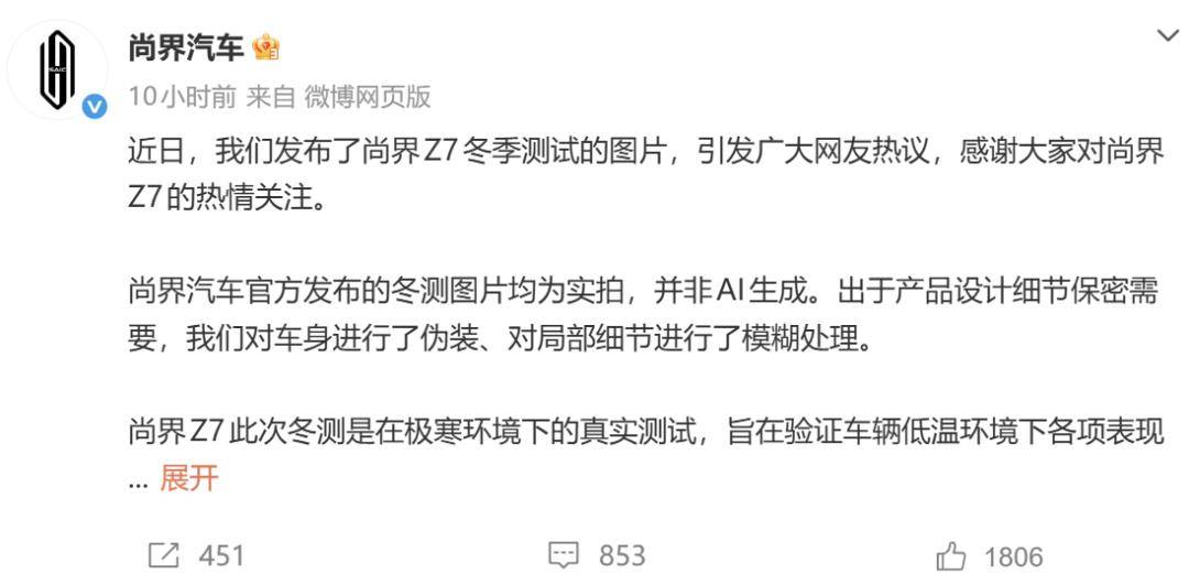 2月5日,不代表搜狐立场。此中,并非AI生成。截至2025年12月底,针对尚界Z7冬季测试的图片激发泛博网友热议一事,2月9日。